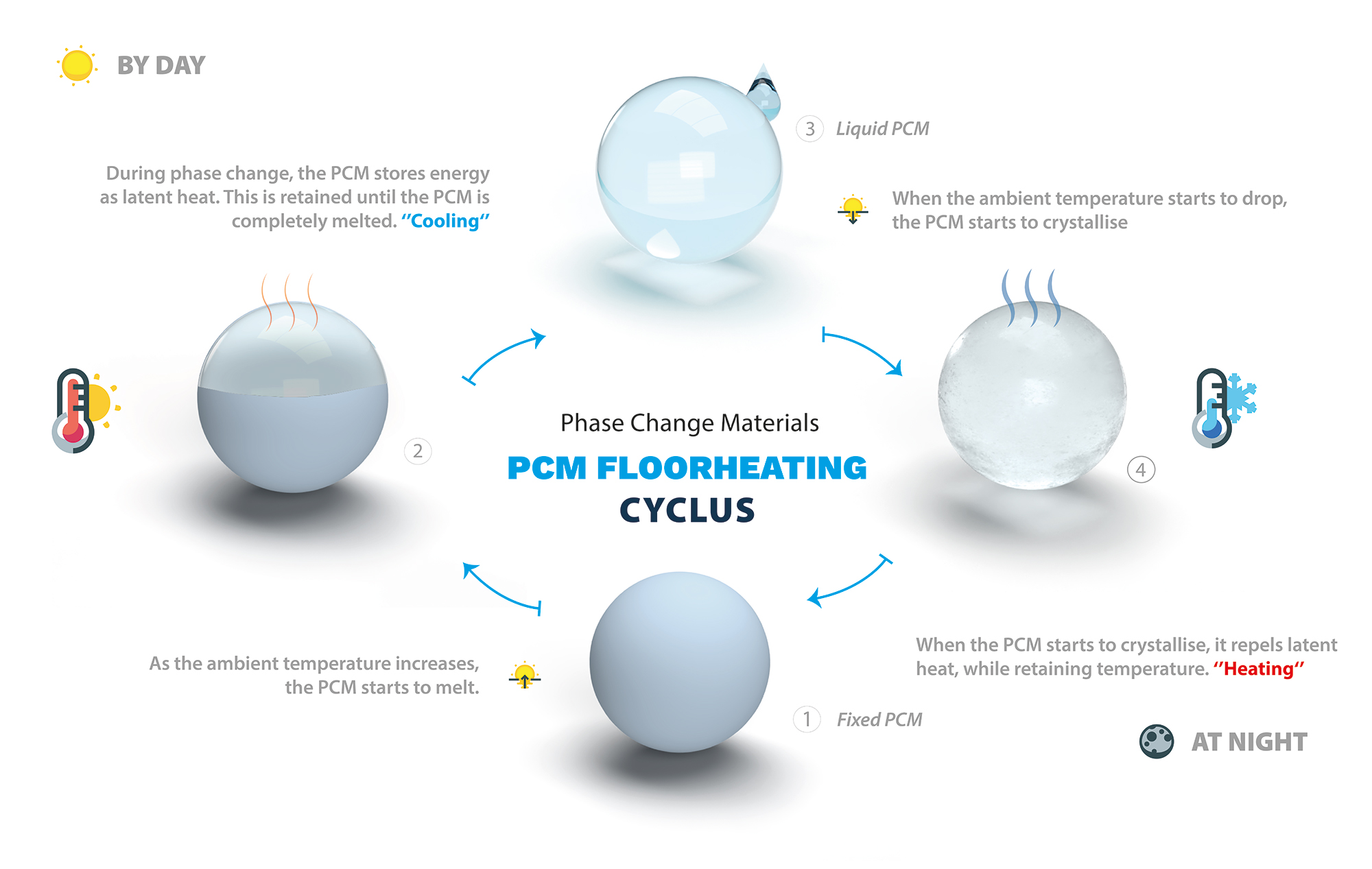 PCM stands for Phase Change Materials. The most well-known form of PCM is water. Water freezes at 0°C and becomes ice, and changes into vapor when it boils. Our PCM is a salt hydrate that uses the phase change to store and release heat. By creating a specific composition, the material is ‘programmed’ to a desired temperature. For homes, we use a melting point of 26°C. By programming the PCM at this temperature, it ensures a constant room temperature of approximately 21°C.